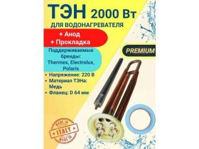 ТЭН для водонагревателя 2,0 кВт, PREMIUM для Thermex, Electrolux, Polaris и др, анод и прокладка, (Италия) 103527747799