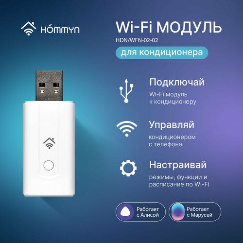 Универсальный USB Wi-Fi модуль HOMMYN это устройство, которое позволяет управлять бытовым прибором по Wi-Fi.Модуль подключается в разъём USB на корпусе бытового прибора и позволяет управлять и настраивать его работу со смартфона через приложение HOMMYN (доступно в App store и Google Play).