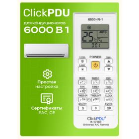 Универсальный пульт для кондиционеров и сплит-систем ClickPdu K-1758E. Пульт содержит в себе 6000 кодов и подходит для большинства кондиционеров поставляемых на наш рынок, даже если бренд не указан в таблице. Настройка пульта производится путем ввода или автопоиска кода, подробная инструкция на русском языке в комплекте. Список некоторых поддерживаемых брендов: Abion. AC. Electric. Aero. Airwell. AIRWELL. Akvilon. ALC. Artel. AUX. Ballu. BOERKA. Bosch. Candy. Carrier. CARRIER. CENTEK. Chigo. CORONA. Dahatsu. Daichi. DAIKIN. Dantex. De'Longhi. Ecoclima. Electrolux. Energolux. Fujitsu. FUNAI. GENERAL. General. Climate. GLEE. GOLDSTAR. GREE. Green. HAIER. HEC. HISENSE. HITACHI. HUABAO. HYUNDAI. Jax. JINDA. Komanchi. KONKA. KRAFT. Lanzkraft. Leberg. Lessar. LG. Loriot. Midea. MITSUBISH. Mitsubishi. Electric. Mitsubishi. Heavy. NeoClima. Neoline. Panasonic. National. Quattroclima. Rapid. Roda. Rovex. ROWA. Royal. Clima. SAMSUNG. SANYO. SHARP. TCL. Timberk. TOSHIBA. Tosot. Whirlpool. Бирюса и многие другие.