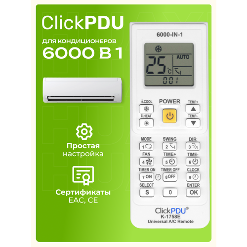 Универсальный пульт ClickPdu K-1758E (KT-9018E) для кондиционеров различных марок Electric, Aero, Airwell, AIRWELL, Akvilon, ALC, Artel, AUX, Ballu, BOERKA, Bosch, Candy, Carrier, CARRIER, CENTEK, Chigo, Dahatsu, Daichi, DAIKIN, Dantex, De'Longhi, Electrolux, Fujitsu, FUNAI, GENERAL, General, Climate, GOLDSTAR, GREE, HAIER, HEC, HISENSE, HITACHI, HYUNDAI, Jax, JINDA, KONKA, KRAFT, Leberg, Lessar, LG, Loriot, Midea, MITSUBISH, NeoClima, Neoline, Panasonic, National, Quattroclima, Rapid, Roda, Rovex, ROWA, Royal, Royal, Clima, SAMSUNG, SANYO, SHARP, TCL, Timberk, TOSHIBA, Tosot, Whirlpool, Бирюса и многие другие.