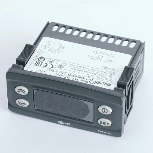 Контроллер Eliwell EW-961 plus предназначен для холодильных установок средней температуры. Он снабжен выходным реле для управления компрессором. Поставляется с датчиком NTC в комплекте. Продолжительность циклов разморозки определяется временными интервалами остановки компрессора. Считываемое датчиком значение отображается на 2-х цифровом дисплее.