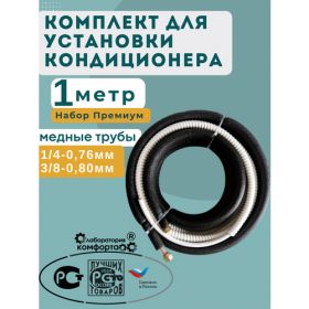 В готовый Набор "Премиум" для установки сплит системы входит: — трубки из толстостенной меди BALLU Standard, либо идентичный ICG 1/4 толщиной 0,76мм и 3/8 толщиной 0,80мм, развальцованные с двух сторон и надетыми гайками в изоляции. — гофрированная дренажная трубка 16мм BALLU для отвода конденсата от внутреннего блока. Дренажная труба идет на 0,5 метра длиннее трубы медной. — межблочный 5-ти жильный кабель 5\*1,5 ГОСТ на 1метр длиннее медной трубки для кондиционера. — изоляция BALLU condiflex powered by K-FLEX. — гайки 1/4 2шт, 3/8 2шт. Гайки уже надеты на медную трубу. Наш готовый комплект "Премиум" для монтажа кондиционера сделан на основе фирменной толстостенной меди BALLU Standard, произведенной в соответствии с европейским стандартом EN 12735-1. Готовые трубки для сплит системы в теплоизоляции с развальцованными концами и гайками для герметичного соединения блоков кондиционера.