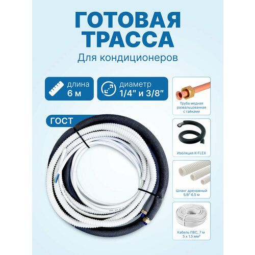 Готовая межблочная трасса для самостоятельного монтажа кондиционера/сплит-системы мощностью до 5 кВт. Состоит из готовых медных трубок 1/4" и 3/8" в теплоизоляции с развальцованными концами для герметичного соединения блоков кондиционера, дренажного шланга 5/8" для отвода конденсата от внутреннего блока, межблочного кабеля ПВС 5х1.5.