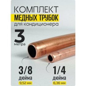 Комплект медных трубок для кондиционера 1/4 и 3/8 по 3 метра применяется для ремонта различного холодильного оборудования: кондиционеров, холодильных витрин, ларей морозильных, холодильников, подходит для работы с газами, например фрионом. Медная трубочка может применяться в качестве материала для змеевика самогонного аппарата, для различных декоративных изделий в стиле лофт loft.