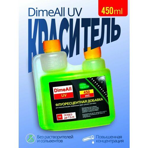 Профессиональная ультрафиолетовая добавка DimeAll UV для холодильных систем и систем кондиционирования воздуха, позволяет произвести поиск утечек из систем циркуляции хладагента (общепринятое название — фреона), в ультрафиолетовом свете. В ультрафиолетовом свете, локальные места утечки хладагента, с заранее введеным индикатором DimeAll UV, становятся, очень хорошо заметны. Ультрафиолетовая добавка является стабильной химически и применима с CFC, HCFC, HFC хладагентами (фреонами).
