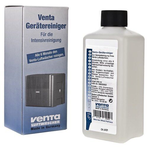 Очиститель для моек воздуха VentaДля моделей: LW15/25/45Очиститель для прибора VENTA был специально разработан для очистителей увлажнителей воздуха VENTA. Эта добавка представляет собой комплекс элементов, направленных на очистку прибора от налета кальция и других примесей из воды. Основным действующим веществом является лимонная кислота и ее производные. В процессе эксплуатации прибор Venta сильно загрязняется, причем не всегда грязь можно удалить просто промывая прибор под душем. Для этого и существует «Venta-Reiniger» (Очиститель для прибора), который удаляет любую грязь. Результаты тестов показали, что при использовании гигиенической добавки VENTA известь от воды и примеси, которые вымываются из воздуха, легко удаляются простым споласкиванием при смене воды. Тем не менее, некоторые области в аппарате невозможно качественно промыть при проведении этой процедуры (например, оси пластинчатых барабанов). В данном случае рекомендуется осуществлять комплексную очистку прибора с использованием Очистителя для прибора VENTA. Очиститель для прибора VENTA не оказывает негативного воздействия на корпус прибора VENTA и абсолютно безвреден. Использование: Как обычно, сначала слейте старую воду с осадком. Затем заполните резервуар водой до отмеченного уровня воды и добавьте в воду Очиститель для прибора VENTA (для LW15=LW14: 1/2 флакона; для LW25=LW24 Plus – 2/3 флакона; для LW45=LW44 Plus – весь флакон). Включите прибор и дайте ему проработать около 2-х часов на 1-ом режиме. (Примечание: чуть теплая вода ускоряет процесс очистки и сокращает время проведения данной операции). Затем слейте загрязненную воду в туалет или ванну, затем сполосните резервуар проточной водой. Теперь мойка воздуха VENTA снова готова к эксплуатации Очиститель для прибора VENTA обладает ярко выраженным запахом, поэтому рекомендуется проводить очистку прибора в хорошо проветриваемом помещении. Состав добавки: вода, лимонная кислота (и ее производные), яблочная кислота (и ее производные), неионные поверхностно-активные вещества, консервант. Очиститель для прибора VENTA изготовлен в соответствии с Регламентом Комиссии (ЕС) по детергентам № 648/2004. Состав добавки: вода, лимонная кислота (и ее производные), яблочная кислота (и ее производные), неионные поверхностно-активные вещества, консервант. Очиститель для прибора VENTA изготовлен в соответствии с Регламентом Комиссии (ЕС) по детергентам № 648/2004. Внимание: данная добавка может быть использована в приборах Venta 6-ой серии.