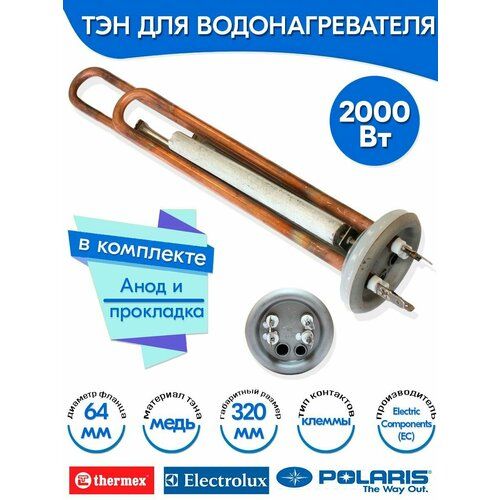 066052EC-К Тэн в комплекте с анодом и прокладкой для водонагревателя Thermex 2000W 220V медь Electric Components (КНР).