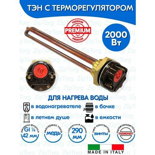 ТЭН ( Нагревательный элемент тип RTD) в комплекте с термостатом (терморегулятором стержневым 80г, 15А с диапазоном регулировки 0°C до +80°C) Устанавливаются в некоторые модели водонагревателей Ariston, Реал, Isea, Gorenje, De Luxe, Thermex и др. Мощность-2кВт (2000Вт) длина-330мм, погружная длина 290мм, диаметр 8,5мм, диаметр резьбы 42мм, G1"1/4. Основание латунный шестигранный фланец с трубной резьбой: G1 1/4 (42 мм). Благодаря резьбовому фланцу легко устанавливается в любые баки, бочки, летний душ и другие емкости. Удобное расположение трубки под термостат, а также контактов для него делает этот ТЭН универсальным и легким в использовании. Стержневой термостат вставляется в трубку и контактные разъемы. К нему подключаются провода и ТЭН готов к работе с возможностью регулировки, автоматического отключения и поддержания нужной температуры. Для обеспечения герметичности в водонагревателе ТЭН устанавливается с прокладкой. Для установки в другие баки и емкости рекомендуем использовать две прокладки по обе стороны стенок, а также контргайку, прижимающую нагревательный элемент с другой стороны. Произведен на заводе Thermowatt (Италия).