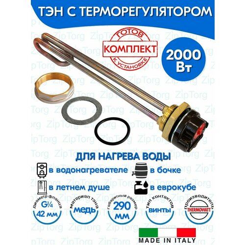 ТЭН с терморегулятором предназначен для работы в водной среде. Изготовлен из медного сплава, обладает высокой теплоотдачей. Широко используется для нагрева воды в различных емкостях, как в бытовом, так и в промышленном применении - водонагреватели бытовые с посадочной резьбой G1¼ (42мм), летние души с емкостями из пластика и металла, пластиковые кубы и бочки разных объемов, промышленные баки, самогонные аппараты. Устанавливаются в некоторые модели водонагревателей ARISTON, THERMEX, GORENJE, De Luxe и во многих других марках.