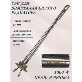 НАЙТИ ВЫГОДНЕЕ - ТЭН для биметаллического радиатора RDT 1000 W, 400 мм/ правая резьба, 3400083