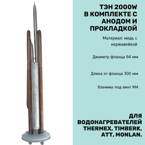 НАЙТИ ВЫГОДНЕЕ - ТЭН 2000 Вт для водонагревателя Thermex, Timberk, ATT, Monlan с анодом и прокладкой