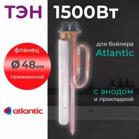 ТЭН Atlantic 1500W комплектуется магниевым анодом на шпильке М5 для продления срока службы ТЭНа, а также резиновой прокладкой диаметром 48мм. Таким образом, данный товар представляет собой ремкомплект для замены перегоревшего ТЭНа в водонагревателе Atlantic - вам не придется ничего приобретать дополнительно.