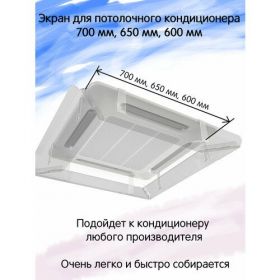 Экран отражатель для потолочного кондиционера, изготавливается из прозрачного ударопрочного пластика толщиной 1,5 мм. Для того что бы определиться с необходимым для вас размером, измерьте наружнюю рамку кондиционера и выберете максимально близкий размер. Очень часто применяется для снижения опасности воздействия холодного воздуха и кондиционера на человека. В офисных помещениях кондиционеры устанавливают исходя из соображения дешевизны монтажа, поэтому экран отражатель для кондиционера в 90 процентах случаев является единственным способом защиты людей от прямого воздействия холодных потоков воздуха. Согласно стандартным размерам кондиционеров нами разработаны основные размеры экранов отражателей для кондиционеров.