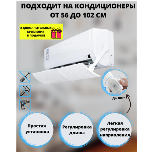 Регулируемый защитный экран (дефлектор) для кондиционера (сплит-системы) - устройство, позволяющее равномерно перераспределить поток холодного воздуха кондиционера, защищая от прямого воздействия и переохлаждения. Позволяет охлаждать помещение без ущерба для здоровья людей. Экран не блокирует сигнал пульта. Экран для кондиционера обеспечит максимальный комфорт для вас и вашей семьи в любое время года. Легок в эксплуатации, не требует сверления стен, дополнительных инструментов и навыков для установки, не портит кондиционер. Просто снять для влажной уборки или чтобы взять с собой.