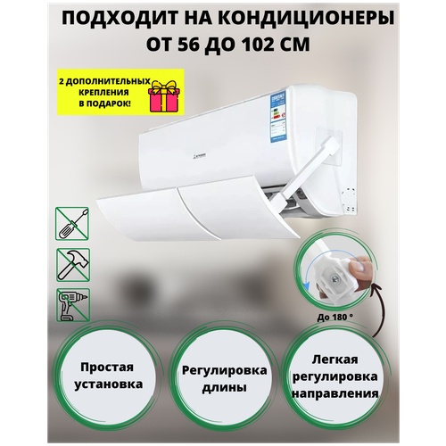 Регулируемый защитный экран (дефлектор) для кондиционера (сплит-системы) - устройство, позволяющее равномерно перераспределить поток холодного воздуха кондиционера, защищая от прямого воздействия и переохлаждения. Позволяет охлаждать помещение без ущерба для здоровья людей. Экран не блокирует сигнал пульта. Экран для кондиционера обеспечит максимальный комфорт для вас и вашей семьи в любое время года. Легок в эксплуатации, не требует сверления стен, дополнительных инструментов и навыков для установки, не портит кондиционер. Просто снять для влажной уборки или чтобы взять с собой.