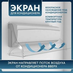 Экран выполнен из прозрачного пластика толщиной 1,5мм. Это легкая и почти невидимая конструкция не требует сложного монтажа. Ничего не нужно сверлить – экран просто вешается на корпус кондиционера, причем, для надежности, три отгиба верхней планки должны войти в щель между кондиционером и стеной.