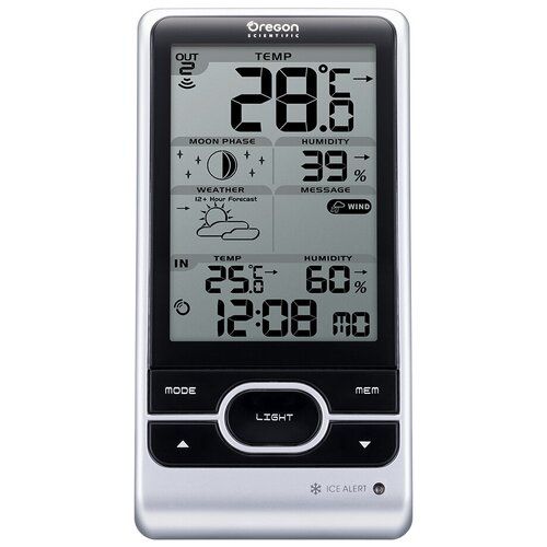 Oregon Scientific BAR208HGX – это компактная домашняя метеостанция, объединяющая опции гигрометра и термометра. Прибор имеет встроенные часы с радиоконтролем времени и календарь, умеет показывать текущую фазу Луны и предупреждать о надвигающейся непогоде. Все данные выводятся на крупный ЖК-экран с теплой подсветкой красно-оранжевого оттенка, управление осуществляется с помощью расположенных ниже удобных кнопок.