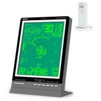 Проекция времени, температуры и прогноза погоды на улице на стену или потолок в тёмное время суток. Лёгкая настройка фокуса и положения проецируемого изображения. Возможность поворота изображения на 180 градусов. Цифровой барометр в mmHg, hPa/mB, inHg, с указанием тенденции изменения атмосферного давления. Мягкая регулируемая подсветка дисплея. График изменения атмосферного давления за последние 24 часа. Часы с системой синхронизации времени и даты по радиосигналам точного времени RCC 77.5 kHz и выбором режима индицирования 12/24 ч. Возможность установки времени в ручную, система DST - автоматический переход на зимнее/летнее время (для стран где не отменен переход на зимнее/летнее время). Вечный календарь с указанием даты, месяца, дня недели на английском языке. Система “Intelligent alarm” (разумный будильник): “gentle alarm” постепенное увеличение громкости сигнала будильника,“snooze” повтор сигнала будильника через 8 минут, “single alarm” однократный звонок, “workday alarm” звонок только по рабочим дням недели. Анимированный лунный календарь с указанием силы приливов и отливов, температура внутри помещения, тенденция ее изменения, температура вне помещения, передаваемая на базовый блок от максимум 3-х автономных радиодатчиков работающих на частоте 433 мГц на расстоянии до 30 метров на открытом пространстве, при отсутствии помех, система автоматического мониторинга температур полученных с радиодатчиков, сигнализация низкой температуры, образования гололёда и заморозков, индикатор состояния батареи базовой станции и радиодатчиков, возможность работы без батареек (в этом случае необходим сетевой адаптер), система DEMO MODE для наглядной демонстрации работы прибора. Радиус приёма сигнала от радиодатчика до 30 метров (при отсутствии помех), часы: кварцевые, система синхронизации времени и даты по радиосигналу RСС 77,5 кГц, проектор: повышенной чёткости, дальность проецирования до 10 метров питание: базовая станция - батарея 2 х 1,5 В типа AA, сетевой адаптер 220 В, 50 Гц/7,5 В, 100 мА, радиодатчик: батарея 2 х 1,5 В типа ААА.