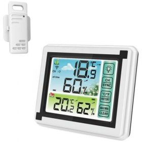 Домашняя умная метеостанция с выносным уличным датчиком и большим экраном. Экран метеостанции разделен на сегменты, в одном отображаются уличная температура и влажность в другом комнатная.