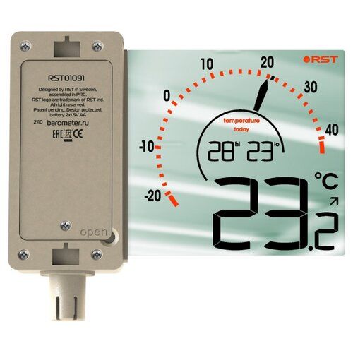 Оконный термометр RST01091 кроме численных показаний температуры имеет на дисплее круговую классическую шкалу со стрелкой, имитирующую циферблат механического термометра с округленными значениями температуры.