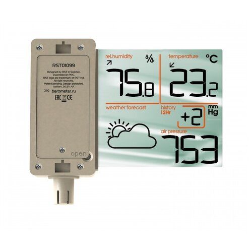 Метеостанция показывает графический прогноз погоды, атмосферное давление в миллиметрах ртутного столба, историю изменения атмосферного давления за прошедшие 12 часов, температуру и влажность воздуха за окном.