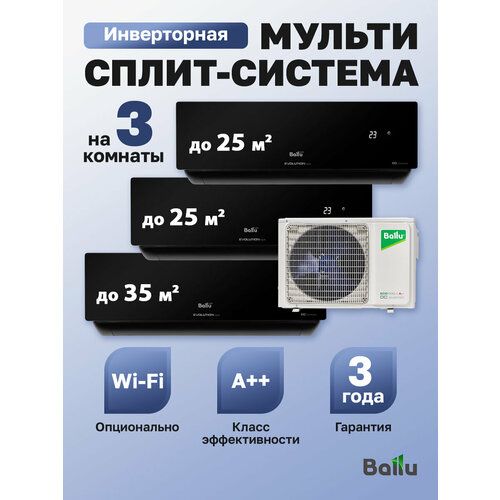 Мульти сплит-система Ballu FREE MATCH состоит из наружного блока BA3OI-FM/out-27HN8/EU, двух внутренних блоков BSUI-FM/in-09HN8/EU_BL и внутреннего блока BSUI-FM/in-12HN8/EU_BL.