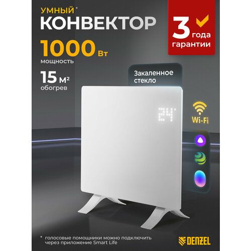 Электрический конвектор Denzel OptiPrime-1000 98121 максимальной мощностью 1000 Вт, с тачскрином, цифровым термостатом и функцией подключения к Wi-Fi, рассчитан на обогрев квартиры, дачи, загородного дома, офиса, а также пригодится в производственных, бытовых и общественных помещениях. Рекомендуемая площадь обогрева — 15 кв. м. Две мощности обогрева 500 и 1000 Вт позволяют поддерживать температуру в отапливаемой комнате и полностью прогревать холодные помещения, Устройство оснащено Х-образным нагревательным элементом — самым долговечным среди аналогов, обеспечивающим максимально равномерный прогрев помещения. Конвектор не сушит воздух, не сжигает пыль и исключает появление неприятного запаха.