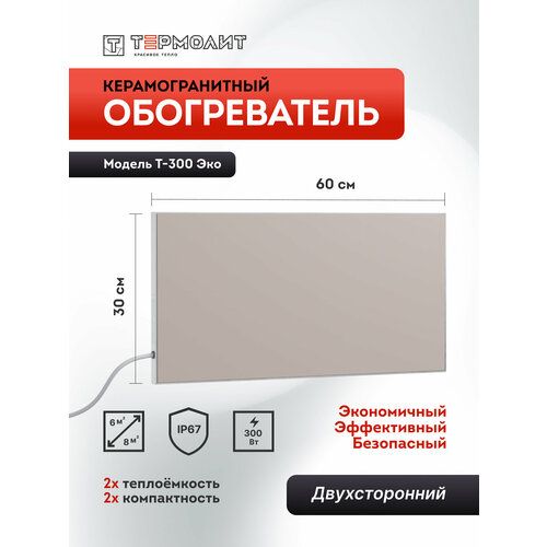 Термолит Т-300 в цвете "Бежевый" - это инфракрасный керамический обогреватель для систем отопления, который предназначен для обогрева помещений площадью до 8 квадратных метров. Он имеет энергосберегающий дизайн и состоит из керамогранитных плит, которые обеспечивают высокую эффективность и экономичность использования.
