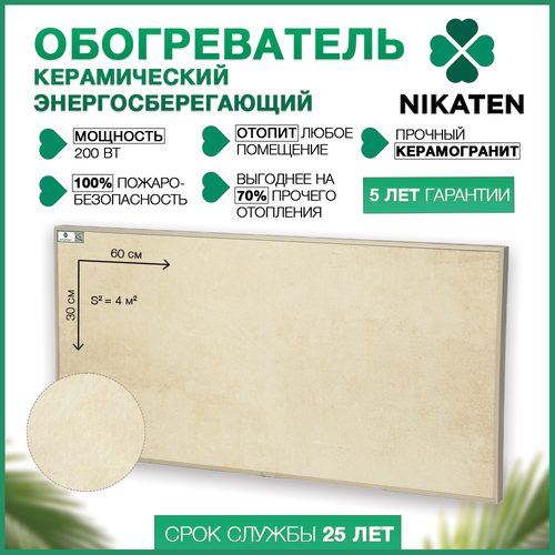 Керамическая панель Nikaten мощностью 200 Вт имеет размеры 60*30 см, настенный тип крепления и предназначена для обогрева помещения площадью до 4 м2.