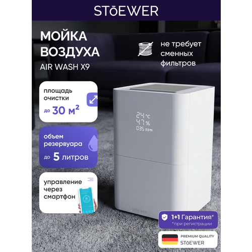 Умная мойка воздуха Stoewer Air Wash X9 очищает и увлажняет воздух в помещениях до 30 м², технология Top Fill для быстрого и удобного залива воды.