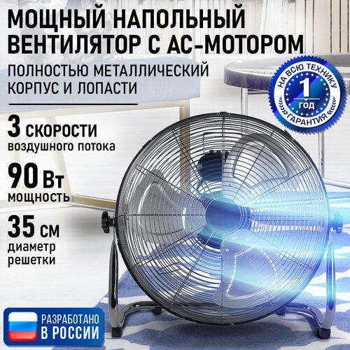 Наопльный вентилятор, 3 метал. лопасти, d=15"/35 см, высокая мощность: 90 Вт, металлический хромированный корпус, 3 скоростных режима, регулировка наклона, безопасная решетка, устойчивая опора. • Промышленный напольный вентилятор в металлическом корпусе с покрытием «Черный хром» диаметром 35 см, с мотором мощностью 90 Ватт и алюминиевыми лопастями создает сверхмощный поток охлаждающего воздуха. • Специальная устойчивая подставка надежно удерживает высокоэффективный вентилятор, а высококачественная металлическая защитная решетка обеспечивает защиту и безопасность. • Низкий уровень шума и 3 скорости работы обеспечивают скорейшее достижение комфортных условий в душном помещении, а возможность регулировки наклона позволит оптимально настроить поток воздуха. • Металлический корпус с хром-эффектом в особенном дизайне украсит самый изысканный интерьер и при этом может использоваться даже в промышленных условиях. • Постоянная циркуляция воздуха в комнате, либо офисе дарит ощущение свежести, способствует лучшему тонусу и отличному настроению в течение всего дня, а ночью – крепкому сну и быстрому восстановлению сил. • Надежные компоненты вентилятора и простое механическое управление обеспечат долгий срок службы без каких-либо проблем. Климатическая техника для дома и офиса. Вентелятор напольный бытовая техника для дома, для отелей. Бытовая техника удобный гаджет для дома. Мощный вентилятор напольный для дачи – не колонный вентилятор. Не вентилятор настольный - устройство для охлаждения воздуха в помещении.