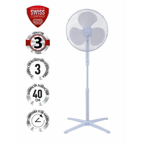 Продуманная конструкция для сборки без дополнительного инструмента. 3 скорости воздушного потока. Регулировка направления потока воздуха. Ступенчатая регулировка угла наклона. Регулируемая высота до 125 см. Безопасная крестовая решетка. Низкий уровень шума. Работа в стационарном положении и с автоматическим поворотом на 90°. Устойчивое основание 66.2х66.2 см. Мощность: 55 Вт.