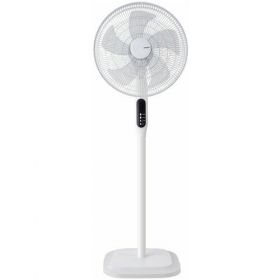 Вентилятор обладает корпусом традиционной формы и расцветки для напольной установки. При мощности 65 Вт и наличии 4 скоростей вращения лопастей прибор обеспечивает оптимальную для людей по температуре атмосферу даже в сильную жару. Для создания направленного потока воздуха можно регулировать высоту модели, поворот и наклон рабочего механизма. С помощью пульта дистанционного управления, Вы можете включать и выключать вентилятор на расстоянии.