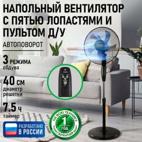 5 лопастей d=16"/40см 50 Вт, материал корпуса: металл/пластик, Пульт ДУ, 3 скоростных режима, таймер до 7,5 часов, ф-я поворота 90°, регулировка высоты и наклона, высота 1,25м, устойчивое основание с утяжелителем, защитная сетка. Напольный вентилятор колонного типа с удобным управлением и мотором мощностью 50 Ватт создает приятный поток охлаждающего воздуха.