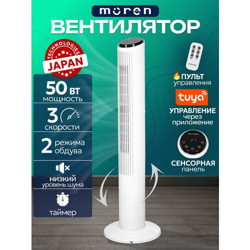 НАЙТИ ВЫГОДНЕЕ - Вентилятор Moren колонный сенсорный, 3 скорости, со смартфона, пульт ДУ, 50 Вт, 102 см, белый