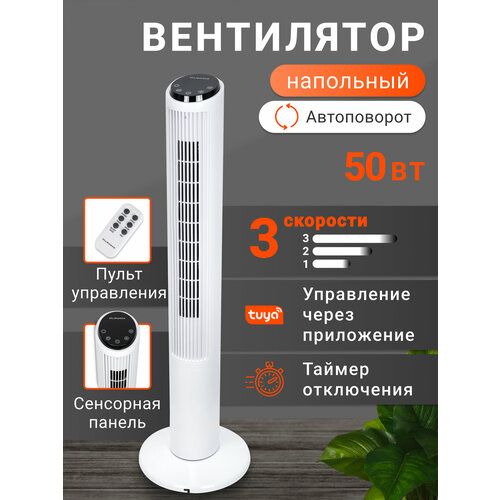 НАЙТИ ВЫГОДНЕЕ - Вентилятор колонный сенсорный, 3 скорости, со смартфона, пульт ДУ, 50 Вт, 102 см, белый