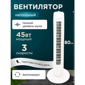 Вентилятор колонный обладает мощностью 45 Вт и тремя режимами скорости, что позволяет регулировать интенсивность обдува в зависимости от ваших потребностей. Оснащен функцией автоповорота, которая обеспечивает равномерное распределение воздуха по помещению.