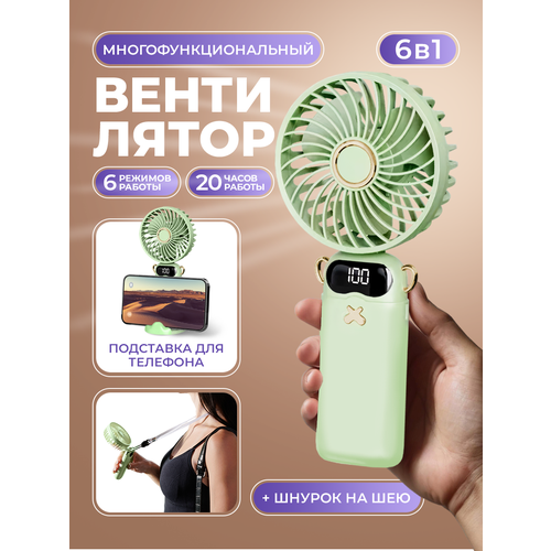 НАЙТИ ВЫГОДНЕЕ - Ручной портативный мини вентилятор с 6-ю режимами скорости и подставкой под смартфон, ремешок для переноски, зелёный