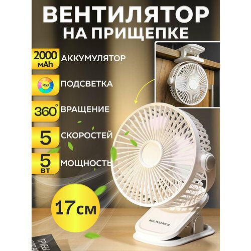 НАЙТИ ВЫГОДНЕЕ - Вентилятор портативный на прищепке, 3 скор, USB, 5Вт, батар 2000мАч, белый, MW PF-4223