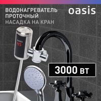 Проточный водонагреватель электрический Oasis - это отличное решение при отсутствии централизованной горячей воды. Мощный нагревательный элемент обеспечивает моментальный нагрев воды до 60 градусов, в зависимости от температуры входящей воды и напора. Небольшие габаритные размеры, совпадающие с обычными смесителями, позволяют легко установить электронагреватель на на смеситель. Удобная регулировка температуры выходящей воды и индикатор нагрева обеспечивают комфортное использование прибора. Основные компоненты прибора, соприкасающиеся с водой, выполнены из нержавеющей стали, устойчивой к образованию коррозии. Подобный смеситель водонагреватель может стать отличным приобретением для дачи, квартиры, загородного дома. Он имеет стильный и современный дизайн и его легко установить самостоятельно.