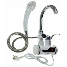 Проточный водонагреватель поможет решить проблему с горячим водоснабжением. Это компактное устройство со встроенным смесителем, может переключать подачу с излива на душевую лейку. У прибора вертикальное подведение воды, что актуально для некоторых ванн и встроенных в стену систем труб. Внутри стоит мощный нагревательный элемент, который быстро нагревает воду до нужной температуры. Процесс происходит настолько быстро, что поток не прерывается. К преимуществам проточного водонагревателя можно отнести и то, что объем подачи горячей воды не ограничивается. Прибор смотрится стильно и прекрасно впишется в современный и классический интерьер. Основная часть корпуса белая, а излив, душевая лейка и ручки-переключатели хромированные.