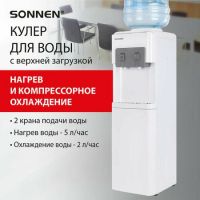 Правый кран подает воду непосредственно в чайник, левый кран под информационным дисплеем - для подачи воды комнатной температуры из бутыли. В верхней части корпуса есть шкафчик для хранения продуктов.