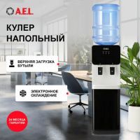 Удобные краны "нажим кружкой" обеспечивают простоту и удобство использования кулера, а гладкая черная лицевая панель и стильный черный цвет с белой вставкой придают кулеру современный и элегантный вид.