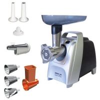 Электрическая мясорубка WILLMARK WMG-3080S с цельнометаллическим корпусом обладает расширенным набором функций и аксессуаров. В комплект прилагаются руководство по эксплуатации, две решётки для мясорубки с пропускными отверстиями 5 и 8 мм, пластиковый толкатель, насадка для сосисок и насадка «кеббе». Сверху расположен широкий металлический загрузочный поддон. Для быстрой и удобной установки используется головы используется мощный металлический рычаг-фиксатор. На корпусе расположен переключатель работы мясорубки. Положение «ON» для начала перемалывания продуктов. Кнопка «REV» для очистки рабочей камеры и вращения шнека в обратную сторону - реверс. Привод мотора и шестерни редуктора выполнены из металла во избежание проворота и вывода из строя мясорубки. Кованый нож способствует максимальной производительности. Две ножки прибора изготовлены в виде присосок для фиксации мясорубки на столе. Производительность 1.2 кг/мин. Номинальная мощность прибора 1500 Ватт, максимальная мощность при блокировке вала достигает 3000Вт. Длина сетевого шнура без вилки 80 сантиметров c сечением провода 2х0,75 мм.