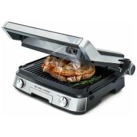 Электрогриль оснащен встроенной плавающей замковой системой для регулировки высоты закрывания крышки и обеспечивает функцию панини для приготовления горячих бутербродов. Гриль раскладывается на 180° и может быть использован в режиме барбекю. Покрытие панелей антипригарное.