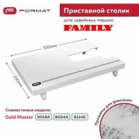 Приставной столик для швейной машины Format изготовлен из абс-пластика, имеет идеально гладкую поверхность. Ножки можно регулировать по высоте, они складные, поэтому когда Вы не пользуетесь столиком, его удобно хранить. Размер 530х330 значительно расширяет рабочую поверхность и равномерно распределяет вес ткани, что позволяет работать с большими проектами (постельное бельё, шторы, квилтинг, пэчворк). Расширяйте свои творческие границы с фирмой Format