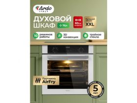 Встраиваемый духовой шкаф Ardo BO810EAW2, XXL, 10 режимов, функция пара, объем 76 л, с Грилем и Конвекцией, функция Аэрогриль, утапливаемые переключатели, тройное остекление дверцы, 60 см 4607280280
