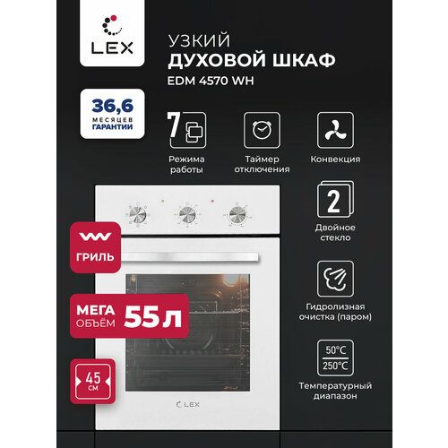 Встраиваемый электрический духовой шкаф LEX EDM 4570 WH предназначен для небольших кухонь, имеет нестандартный размер 45 см, но увеличенный внутренний объем 58 л. Это реализовано благодаря уникальной технологии Spase+, разработанной инженерами LEX. Духовка имеет белый цвет, оснащена комфортной, яркой подсветкой, семью режимами работы, включая конвекцию и турбо гриль, которые можно использовать, как отдельно, так и вместе. Технология Confit позволяет использовать томление при низкой температуре. Съемные дверца с системой SnapOff и двойное стекло, эмаль легкой очистки, хромированные направляющие делают духовку LEX EDM 4570 WH удобной в эксплуатации и чистке.