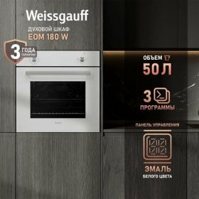 Электрический духовой шкаф от Weissgauff, выполненный в белом цвете, оснащённый механическими поворотными рукоятками Soft Switch и двойным остеклением дверцы воплощает в себе принцип разумной достаточности, предлагаю пользователю только самые необходимые и нужные режимы по действительно доступной цене Режим нижнего ТЭНа, Предварительный нагрев, Обычный режим.