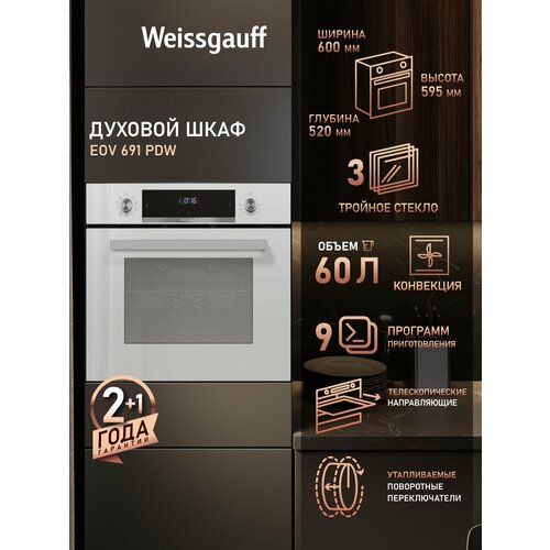 Электрический духовой шкаф Weissgauff EOV 691 PDW / EOV 691 PDB, белый 3 года гарантии, Утапливаемые рукоятки PIPO, Каталитическая очистка, Эмаль SMART CLEAN, Класс энергопотребления А, гриль 101770916888